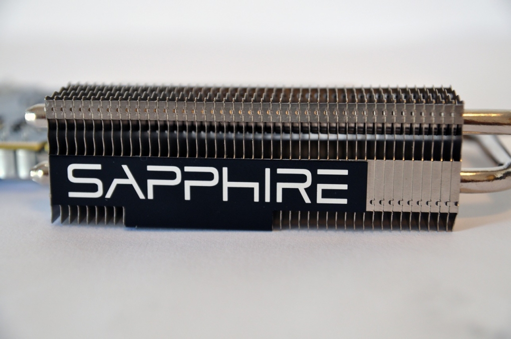 Ecco come si presenta la scheda una volta tolto il dissipatore. Notiamo dei pad adesivi alla base di esso e sopra la scheda. Il montaggio e smontaggio del dissipatore è molto facile e ci consente di cambiare la pasta termo conduttiva nel giro di pochi minuti. Il dissipatore è ben più ampio rispetto a quello della versione con ventola`, ed è dotato di ben tre heatpipes per smaltire il calore anche in assenza di un buon flusso d’aria. La parte a contatto con la cpu è in rame per favorire lo scambio termico con le heatpipes. Due heatpipes convogliano il calore ad un’ulteriore parte del dissipatore presente nella parte superiore della scheda. La scritta Sapphire al di sopra di esso rimarrà in bella mostra in caso di installazione in un case finestrato.